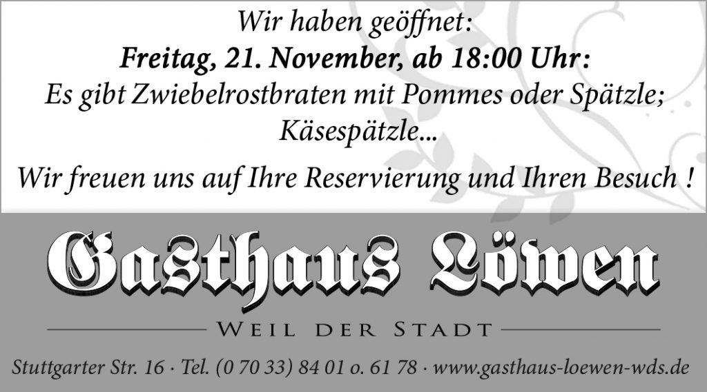 +++Freitag, 21. November sowie 05. Dezember 2025 ab 18:00 Uhr+++Christkindlesmarkt Mo., 15.12. ab 10:30 Uhr+++ Löwen geöffnet+++